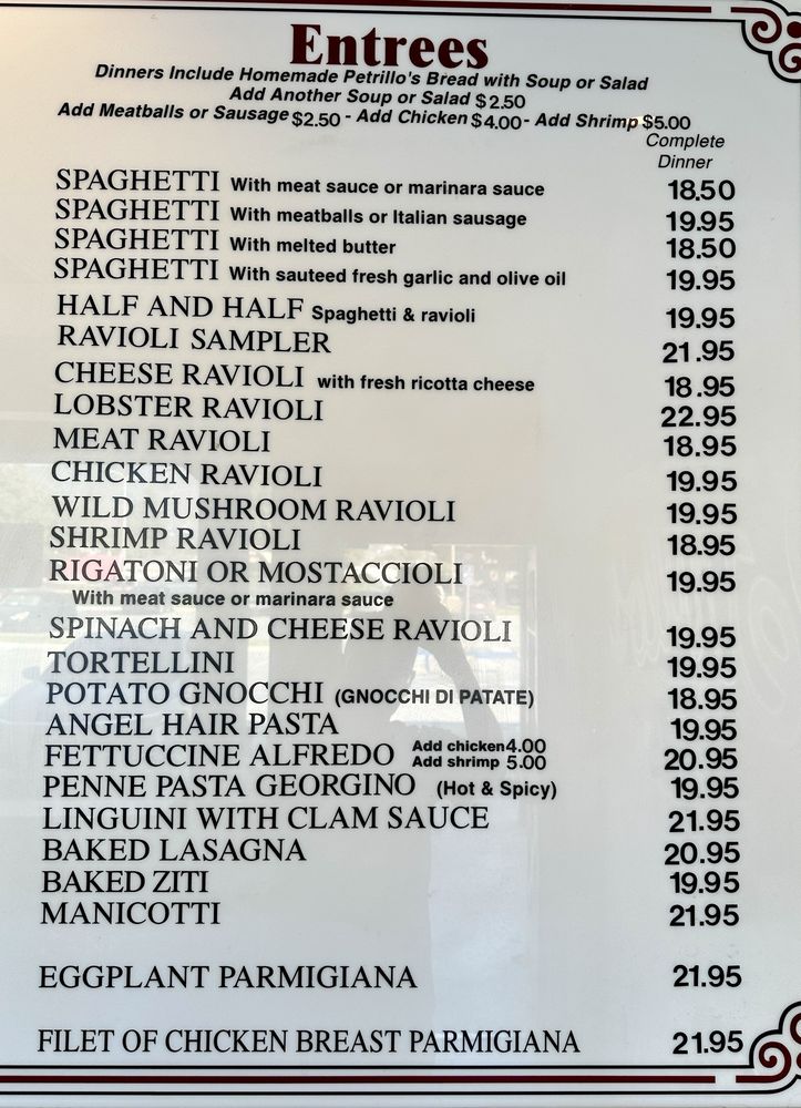Your choice of any two of the entrees served with soup, salad, Petrillo's bread and butter.
